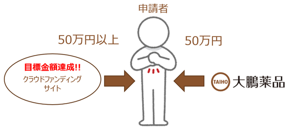 ※1:プロジェクトを達成するために必要な全資金の50%をクラウドファンディングの目標額とし、大鵬薬品が支援する金額は残りの50%です。支援の有無はクラウドファンディングの成否により決定されます。