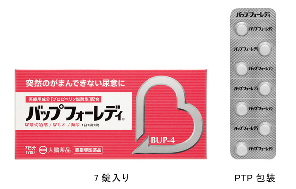 「バップフォーレディ」は、医療用医薬品のバップフォー®を要指導医薬品にスイッチし、薬剤師から対面での指導のもと薬局で購入することが可能となった女性向けの*1OTC医薬品です。尿意切迫感(急に尿がしたいとの我慢し難い訴え)、尿意切迫感を伴う頻尿(尿の回数が多い)・尿もれを改善します。